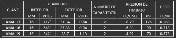 Manguera ligera, diseñada para descarga y riego de agua, su tubo soporta soluciones herbicidas, la cubierta tiene buena resistencia a la abrasión y al intemperismo.
