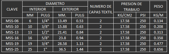 Cubierta con excelente resistencia a la abrasión y al intemperismo, capas de soportar presiones de hasta 250 psi.