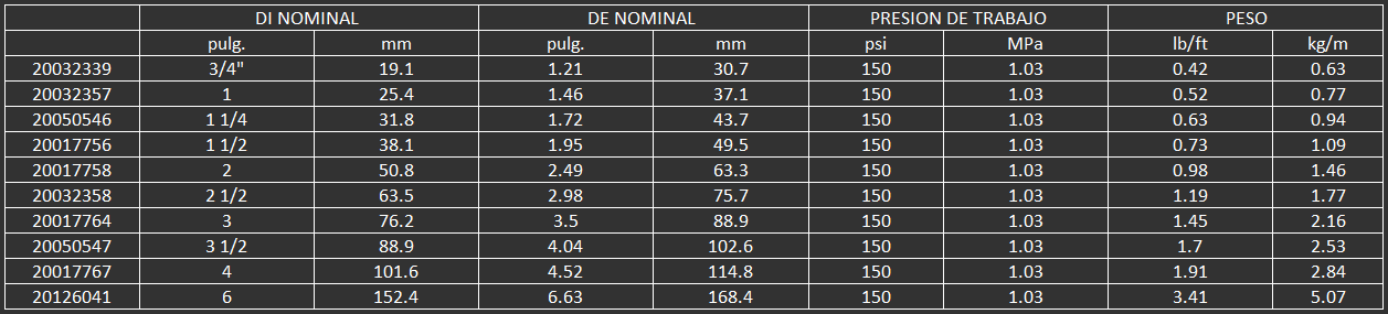 Refuerzo Capas de tela sintética en espiral (2"–4": 2 capas; 6": 4 capas), con cables para puesta a tierra