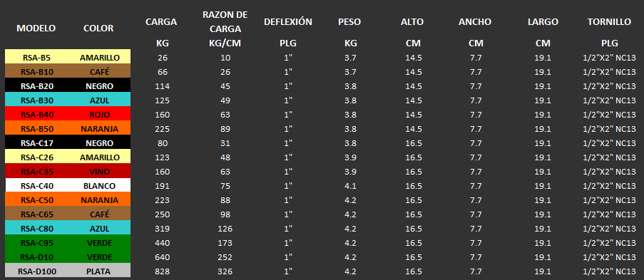Los soportes RSA tienen la ventaja de la gran deflexión de los resortes junto al envolvente de fundición que funciona como un exoesqueleto que protege al resorte de movimientos de paros y arranques del equipo o bien de vibraciones anormales. Su base de hule antiderrapante también hace la función de absorber vibración y ruido. Para aumentar la carga de estos soportes se puede poner un resorte interior C99L lila que da 130 kg. más de carga con la misma deflexión. Cumplen con ASRHAE, libro Applications, cap. 47, sec. 47.44, type 4 “Restrained spring isolators”.
